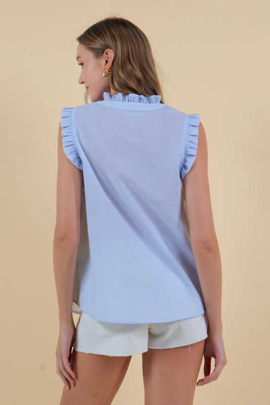 Seersucker Stripe Mock Neck Ruffle Trimmed Sleeveless Button Down Shirt