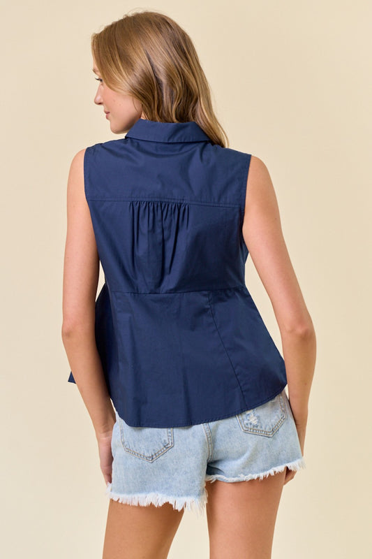 Cotton Poplin Collared Neck Sleeveless Pleated Blouse