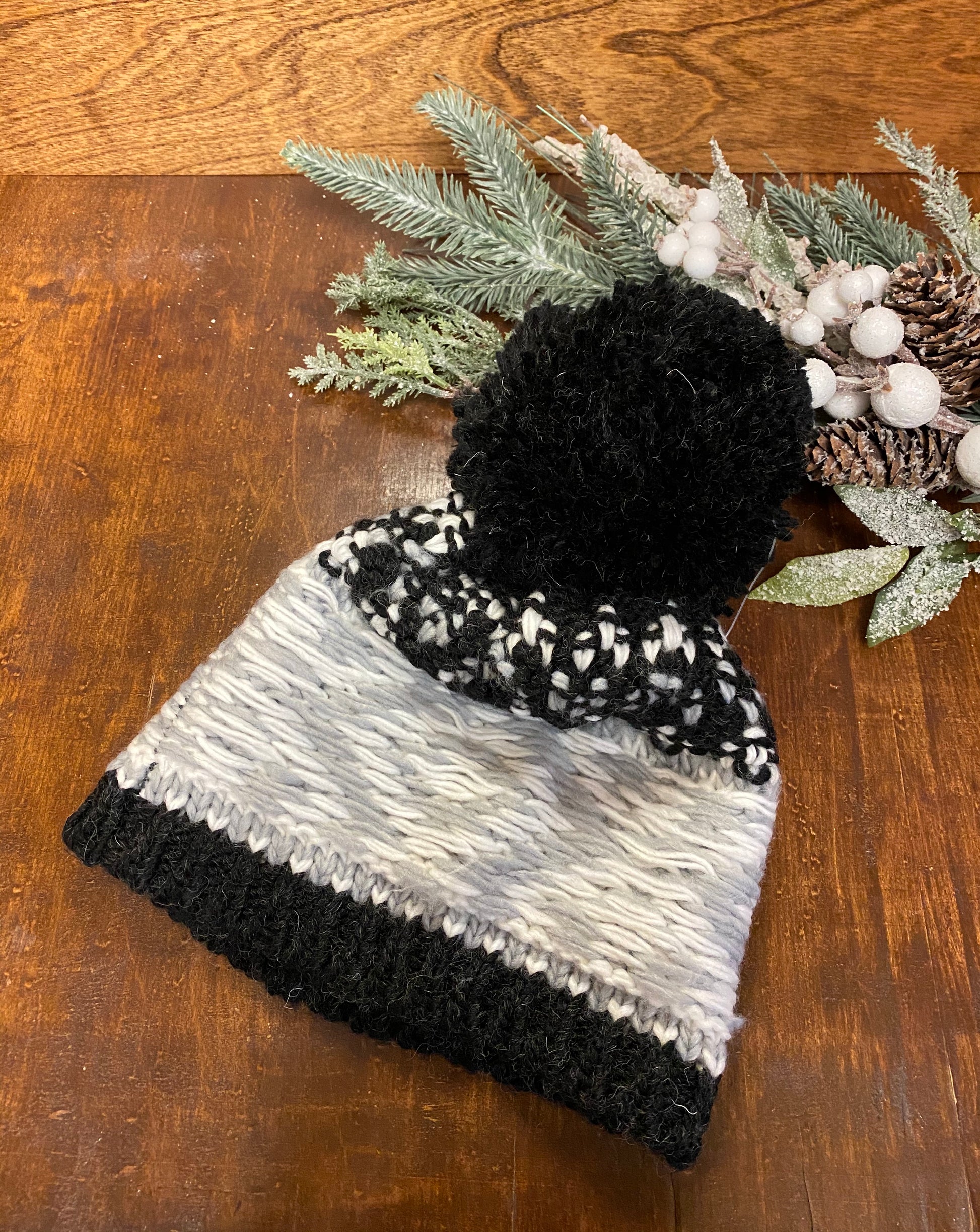 Stay cozy and warm in this gray and black hand knit hat with an extra large pom on top.