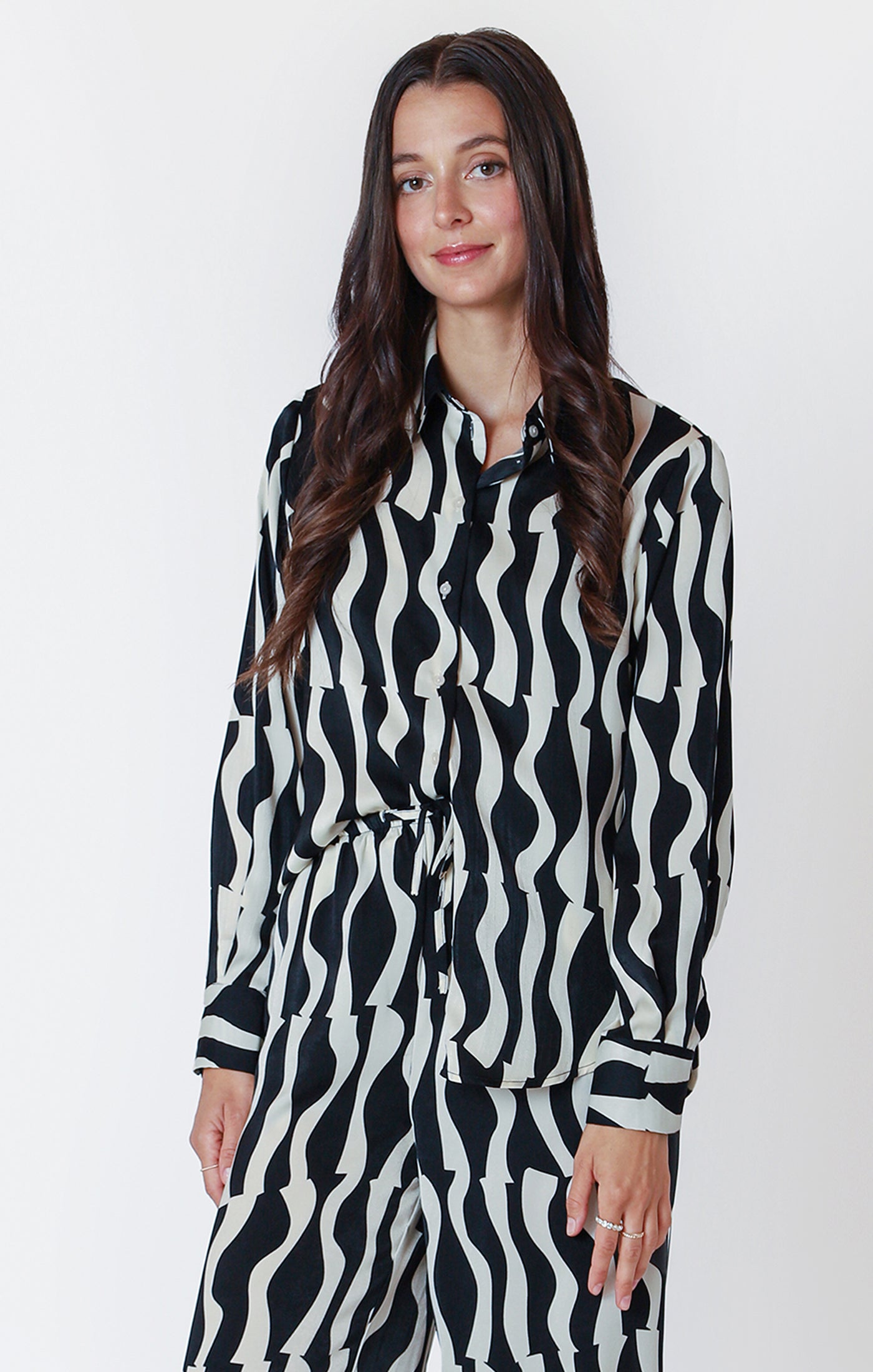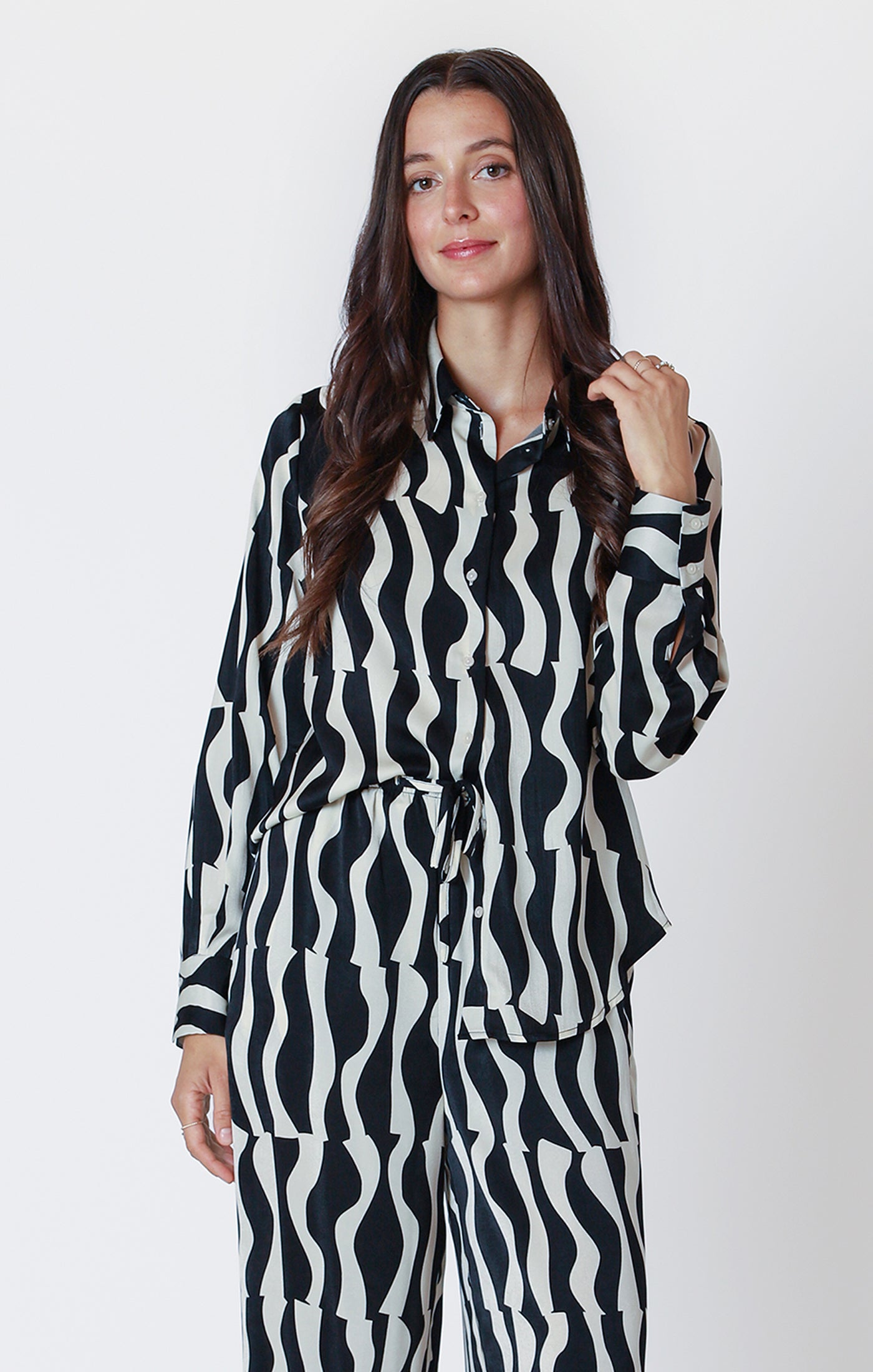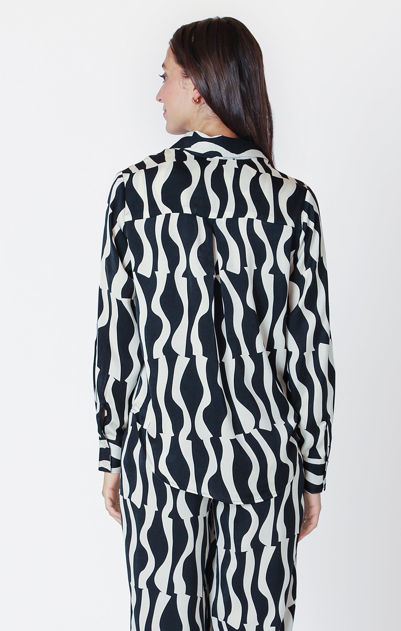 Add a touch of sophistication to your wardrobe with our Black & White Wave Satin Blouse. Made from high-quality satin, this blouse features a unique wave design in striking black and white. Perfect for both casual and formal occasions, this blouse will elevate any outfit with its elegant and stylish look.
