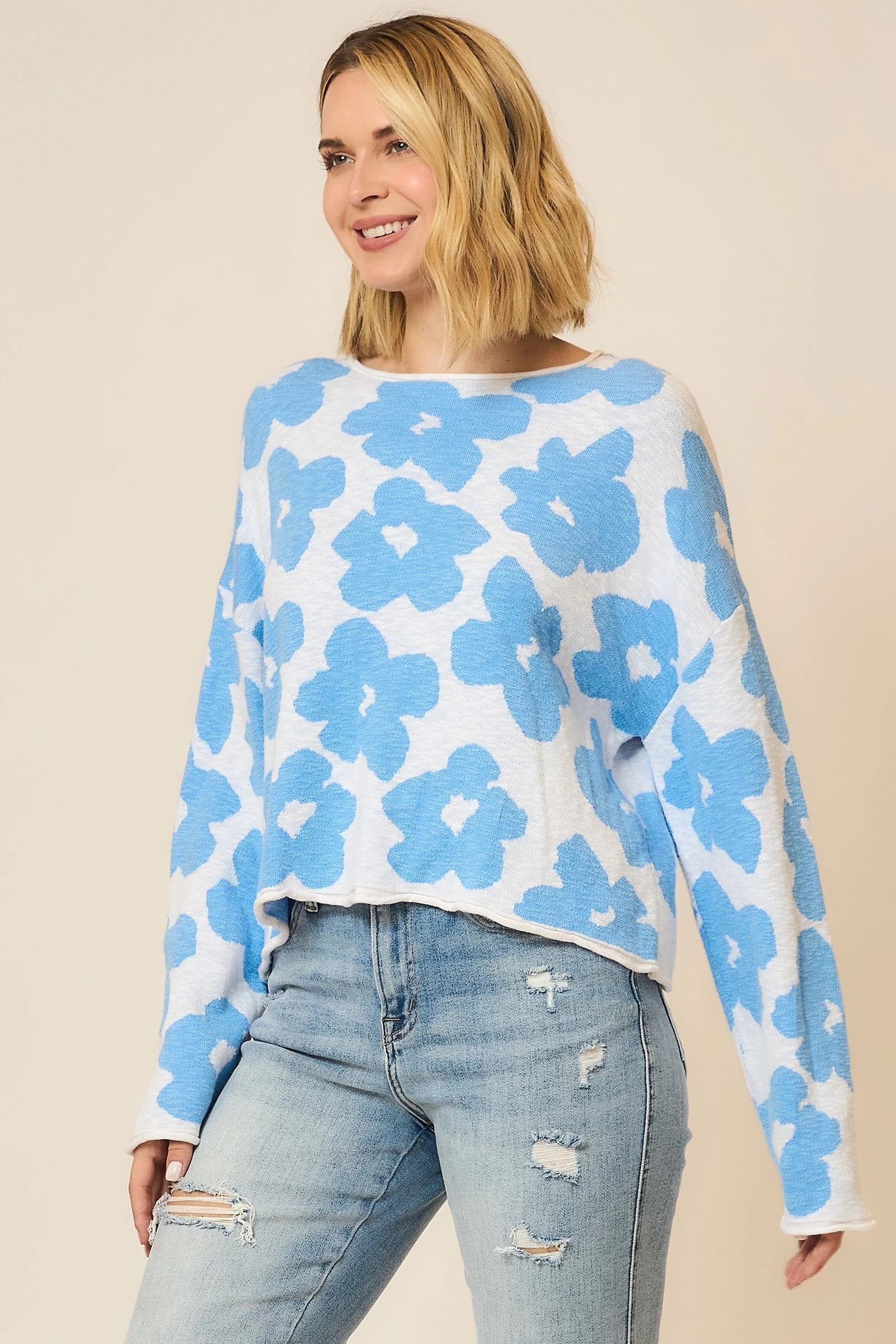 Meet your new easy favorite. This denim-blue knit sweater features a delicate jacquard floral pattern and a flattering boat neckline that shows just the right amount of skin. The lightweight knit makes it perfect for layering or wearing solo, and the relaxed fit gives it that effortless “I just threw this on” vibe. Pair it with your favorite Judy Blues for a cozy-cute everyday look.