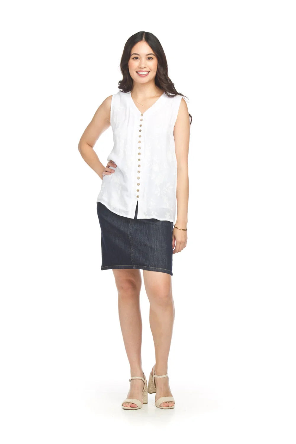 This stunning sleeveless blouse features intricate embossed crinkle details and delicate button accents. The perfect addition to any wardrobe, this blouse exudes elegance and is sure to elevate any outfit.