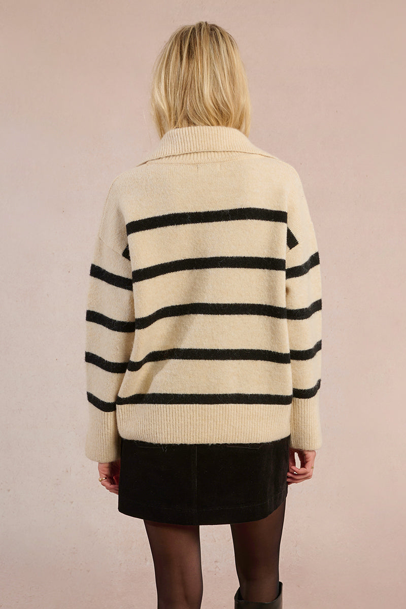 Stripes never go out of style, especially when they’re this cozy. This cream fuzzy knit with bold black horizontal stripes brings the perfect mix of comfort and polish. Featuring a chic split neck with collar and playful split sleeve details, it’s a fresh twist on your classic striped sweater—soft enough for lounging, stylish enough for stepping out.