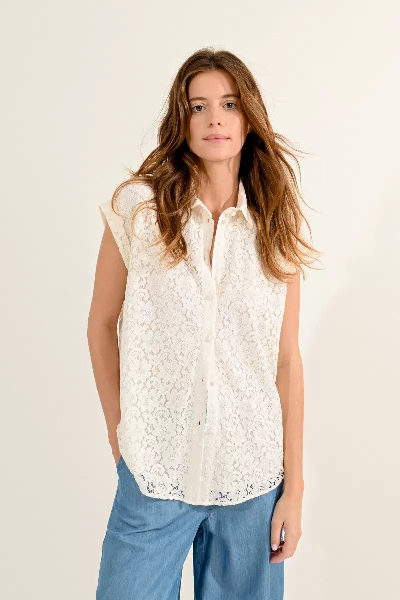 This playful sleeveless shirt has a wide silhouette that will capture your heart, with its delicate lace and front lining adding a touch of femininity. Perfect for those seeking a fun and flirty look.