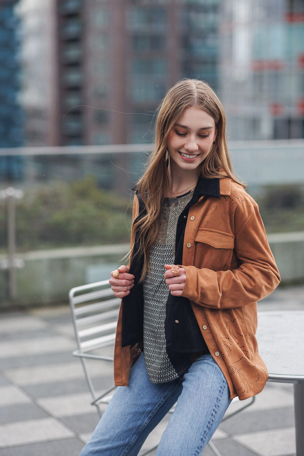 Elevate your fall style with this camel laser-cut suede top. The intricate detailing adds a touch of artistry, while the button-front design makes it versatile for layering or wearing on its own. Soft, luxe, and effortlessly chic—this is the statement piece your wardrobe’s been waiting for.