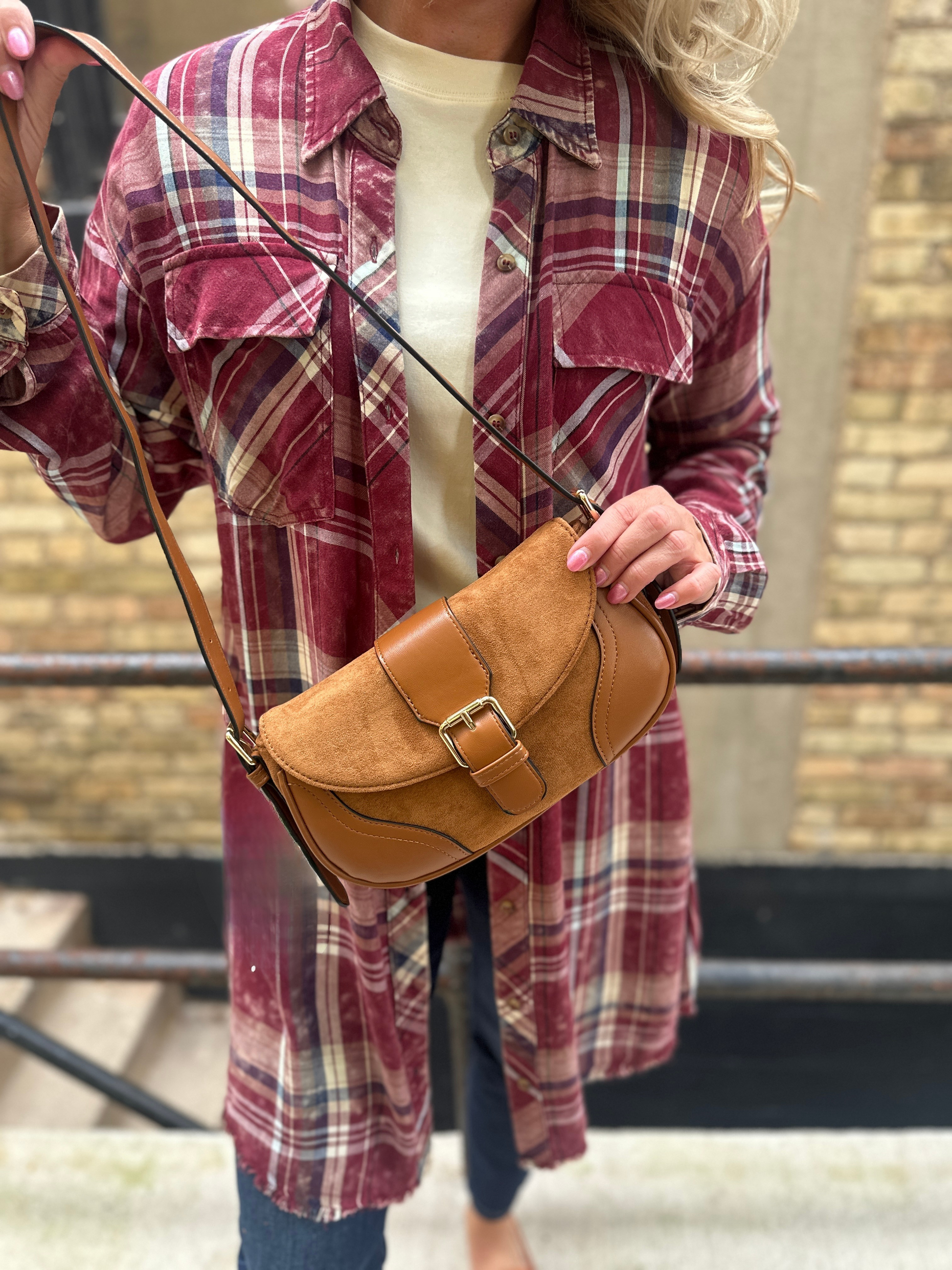 The Duffy Contrast Suede Shoulder Bag offers a unique blend of soft textures and structured details, perfect for those seeking versatile, mixed-material styles.