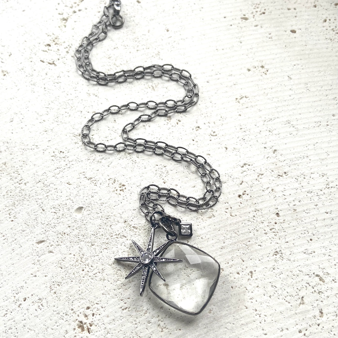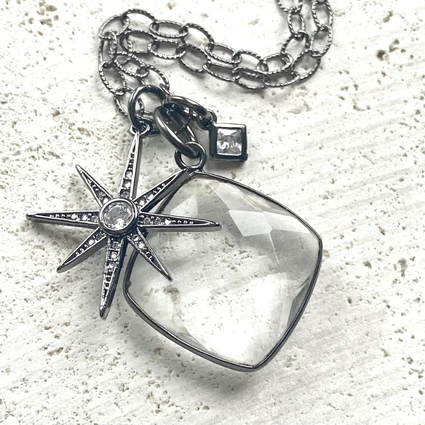 This cluster is so cute and trendy. Made with genuine crystal quartz, a micropave starburst and clear cz charm.