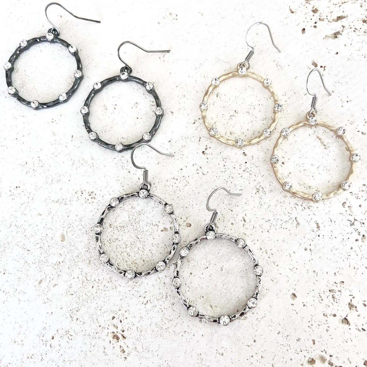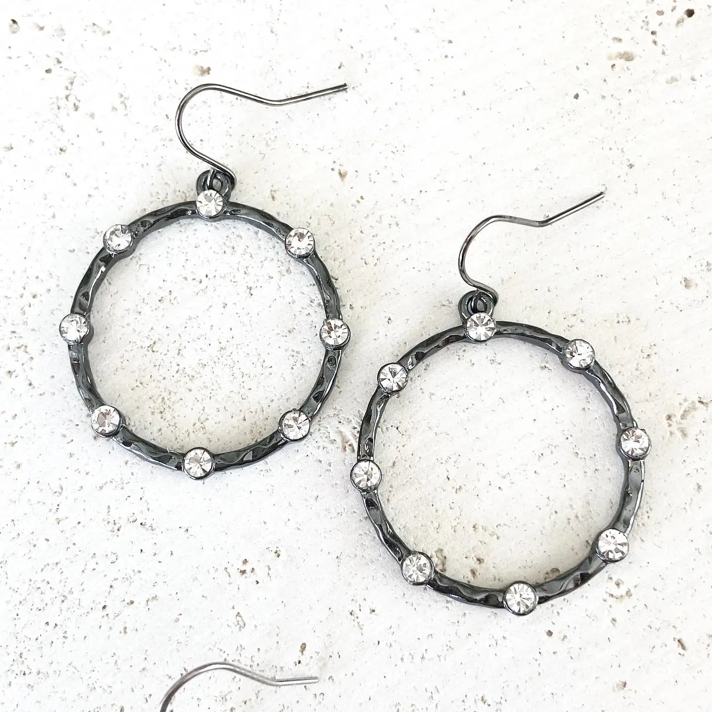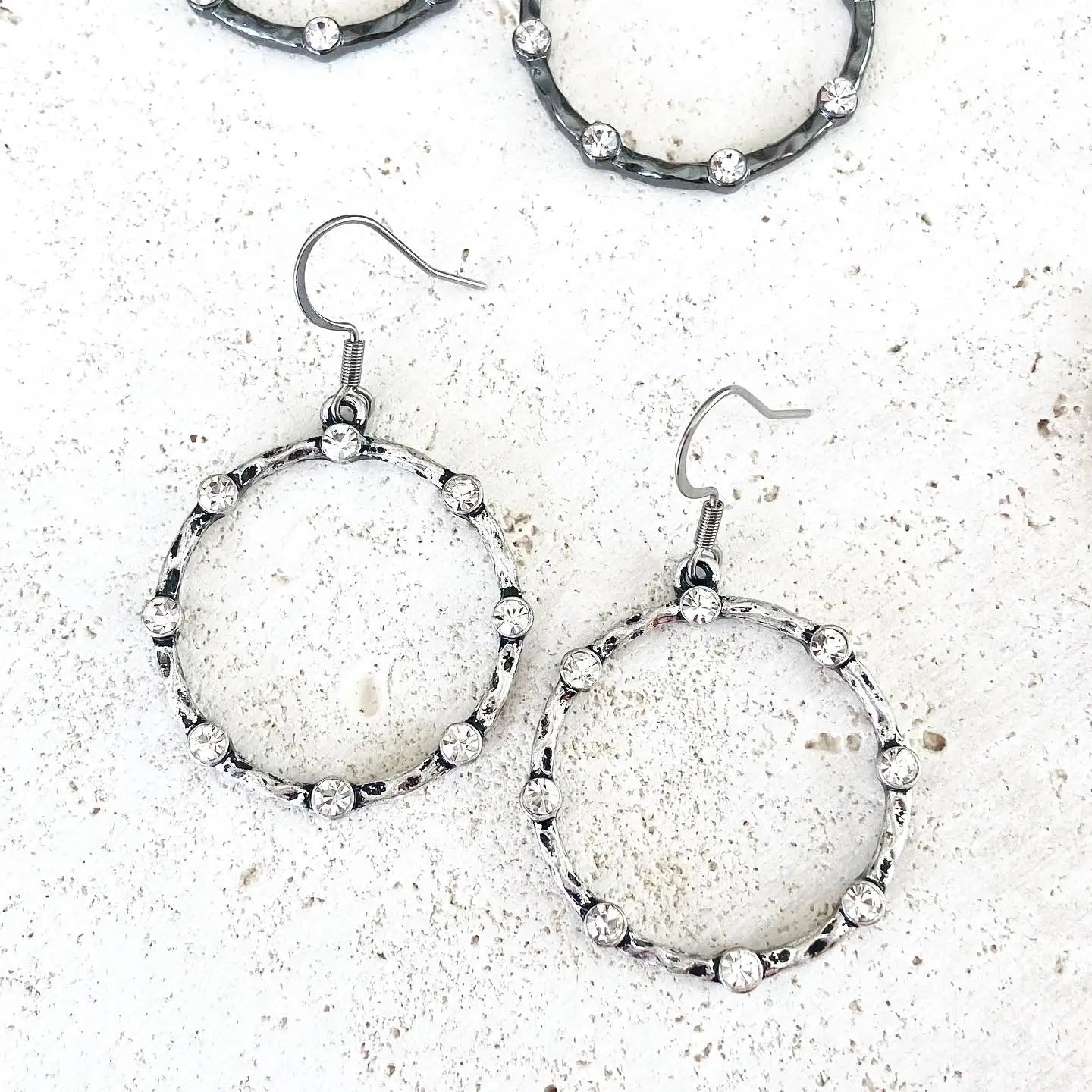 These round edgy glam earrings are sparkly. They catch the light well. Sure to be a customer favorite! Style them casual or dressy.
