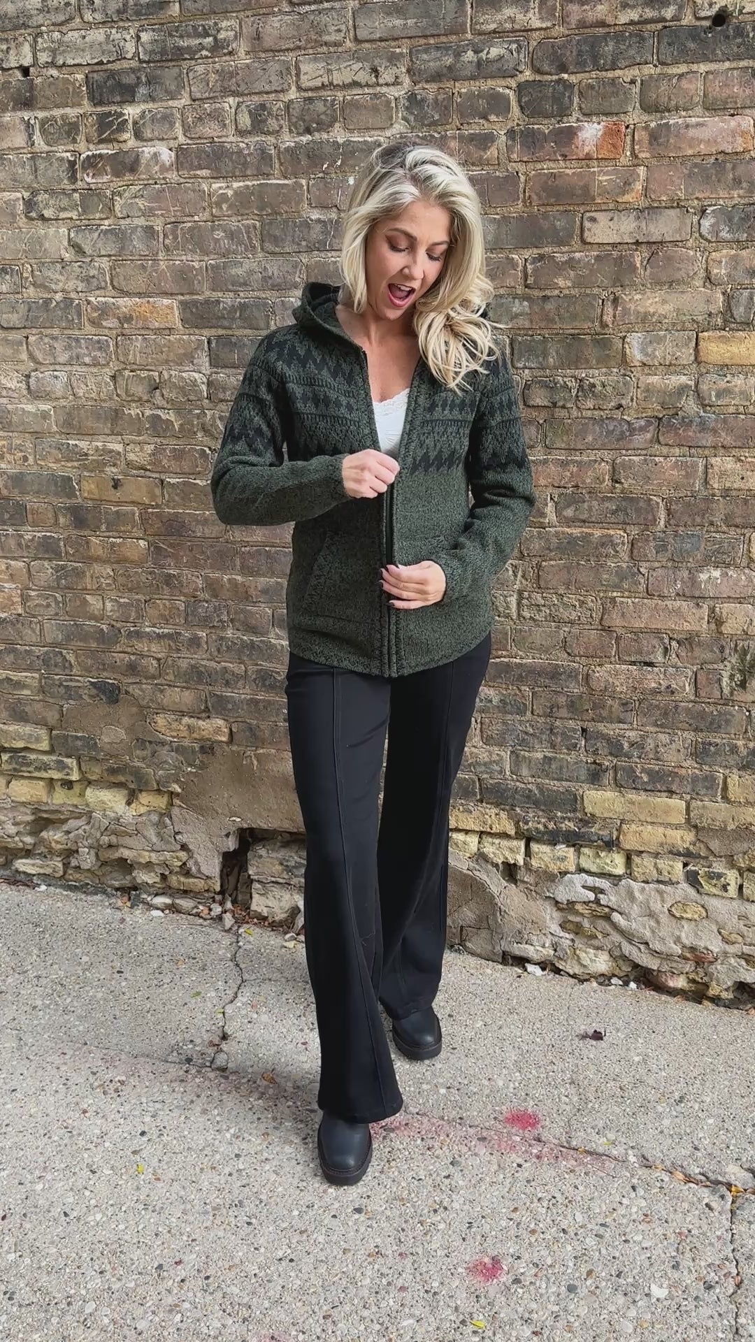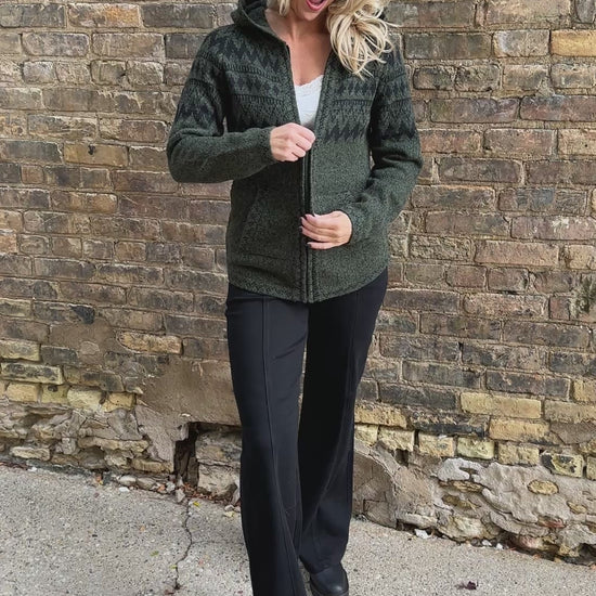 Stay snug and stylish in this olive Fair Isle knit short jacket. Featuring a classic hood, roomy pockets, and a touch of timeless charm, this jacket is the perfect layer for crisp autumn days. The Fair Isle pattern gives it a cozy, cabin-inspired feel that looks just as good in the city as it does fireside.