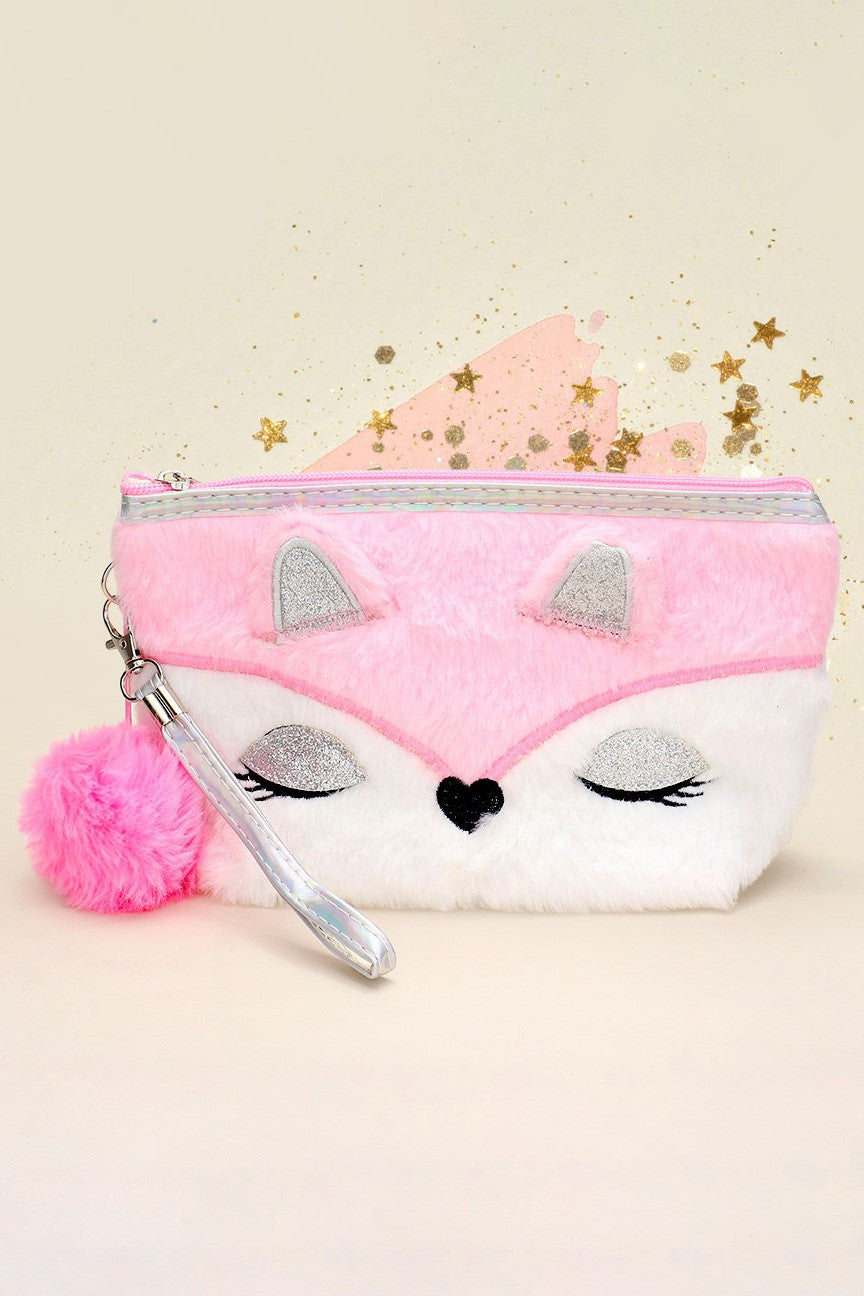 Fuzzy Animal Face Pom Pom Pouch Wristlet Bag