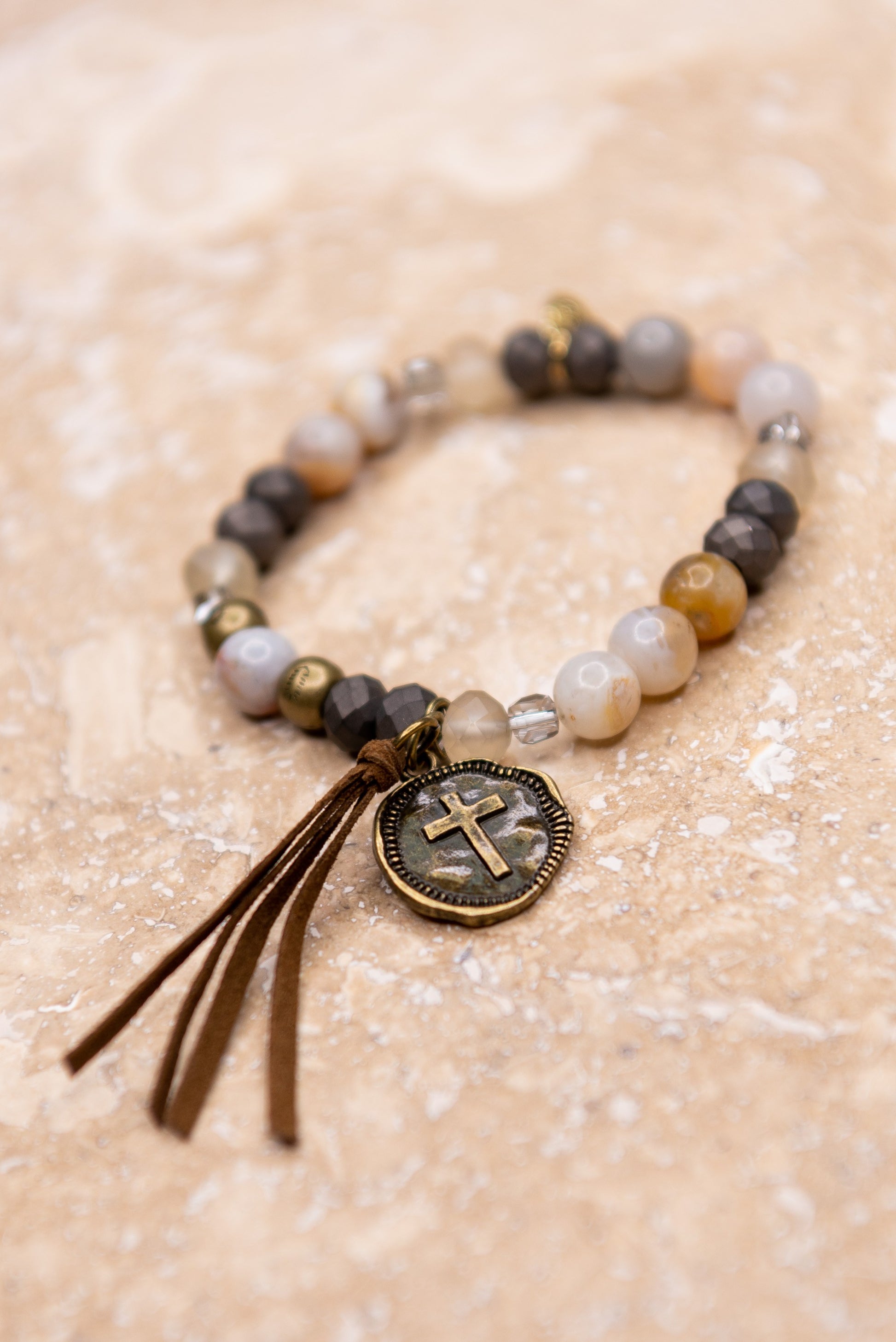 Our Gray Remy Bracelet offers a dashing combination of bronze coin and brown tassel, with elastic and natural stone beads completing the design. Flaunt this piece of jewelry and show your attention to detail.