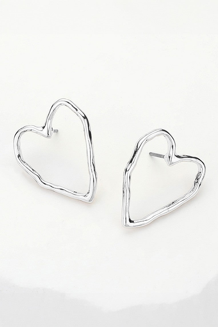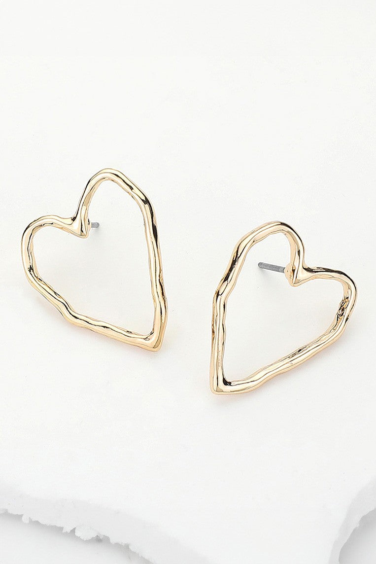 Make a statement with these unique Hammered Metal Open Heart Stud Earrings. The hammered metal design adds an edgy twist to the classic heart shape, making these earrings perfect for those looking to add some personality to their style. Stand out from the crowd with these playful and fun earrings.