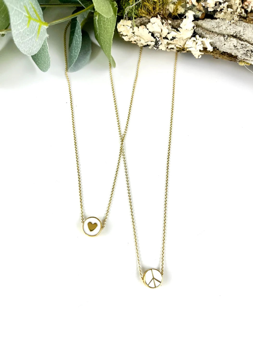 This super sweet dainty necklace offers you the choice of a white enamel heart or peace sign to express yourself! It's the perfect length at 14" with approx 1 1/2" of extension chain. The gold chain is great quality and you will have so much fun wearing this one!