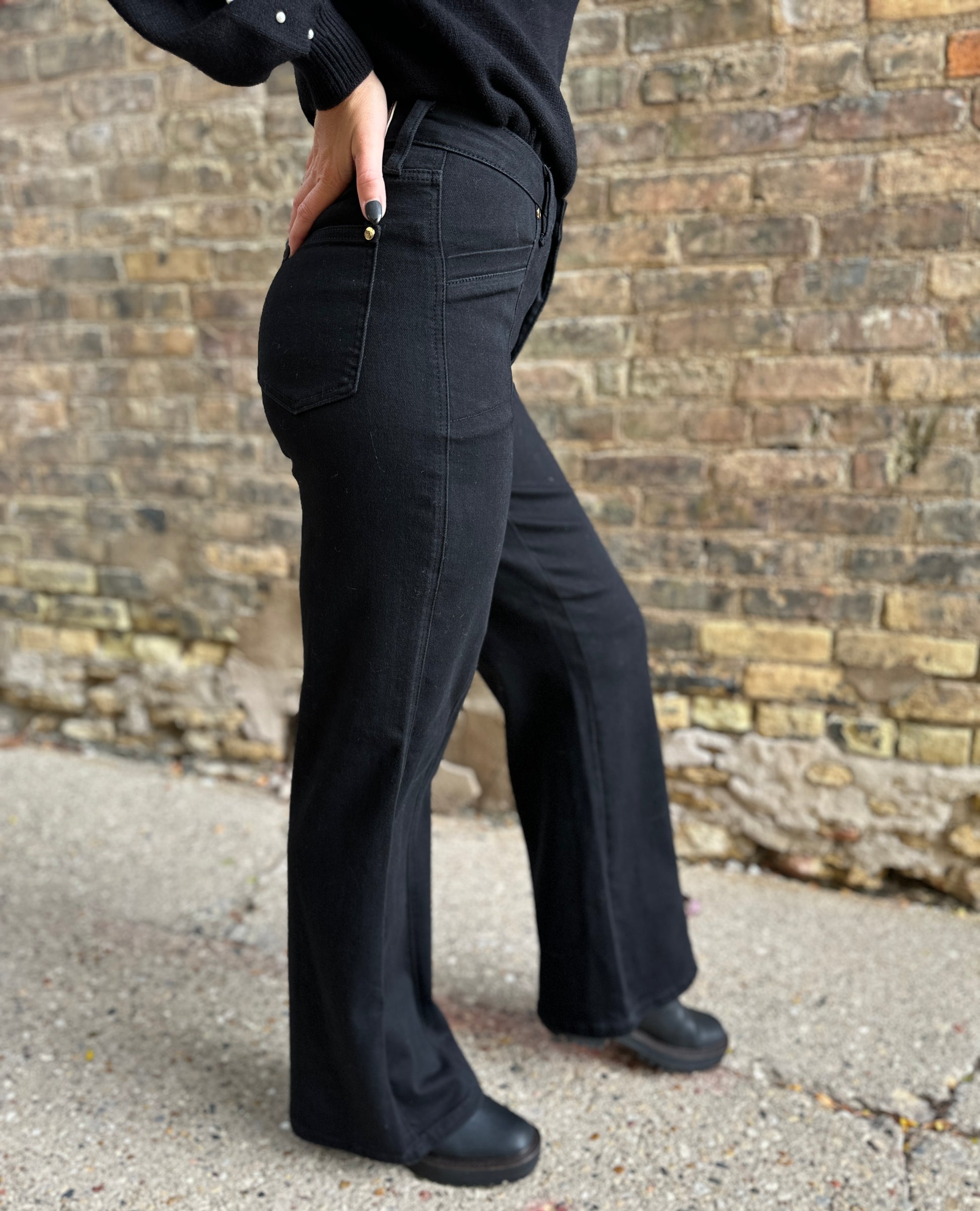 Classic meets modern in these Judy Blue retro wide leg jeans. The high waist fit gives you a flattering silhouette, while the jet black wash adds endless versatility for day-to-night styling. With their comfortable stretch and timeless wide leg cut, these jeans are the go-to pair that make every outfit feel instantly elevated.
