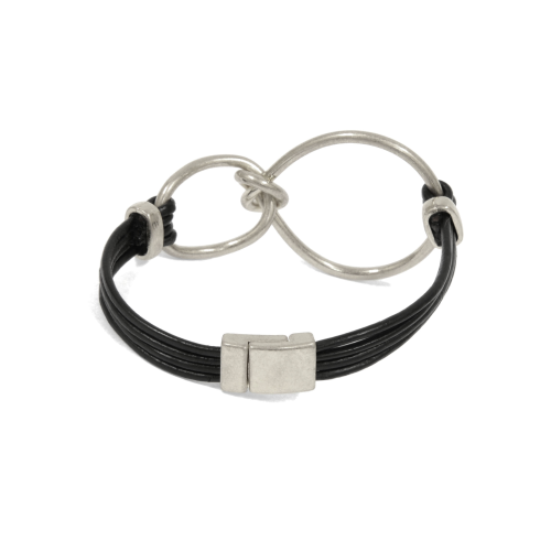 This leather bracelet with knotted rings provides an alluring combination of texture and style. Crafted with genuine leather, the bracelet bolsters confidence and sophistication, perfect for any night out on the town. Its subtle luxury is sure to leave an unforgettable impression.