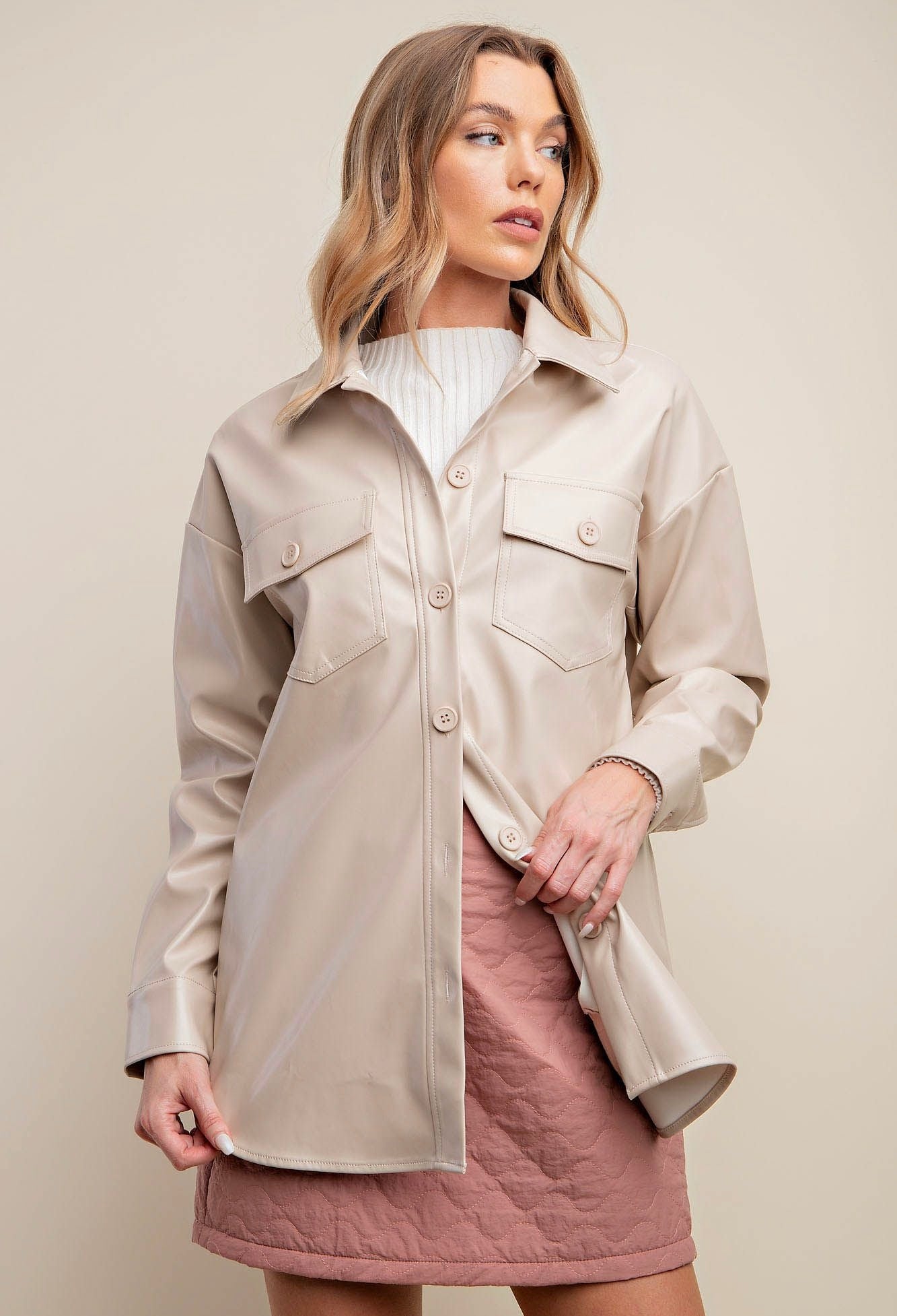 Get ready to turn heads with our Loose Fit Faux Leather Button Up Shirt. This shirt combines the edgy look of faux leather with a comfortable loose fit that will make you feel confident and stylish. Perfect for making a statement without sacrificing comfort.