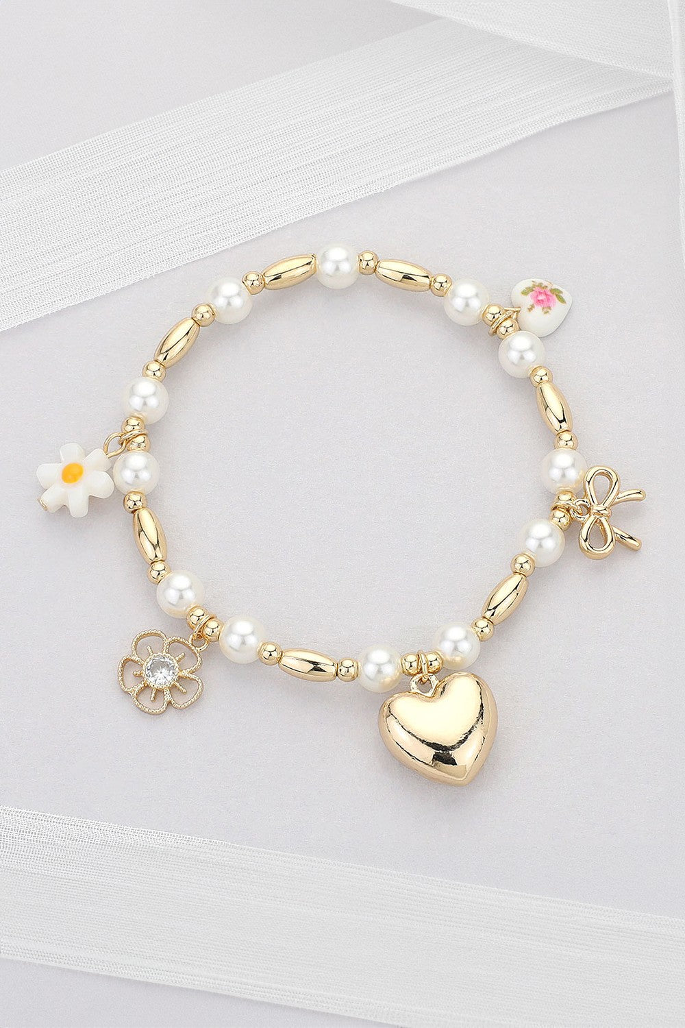 Metal Heart Bow Flower Ceramic Heart Charm Station Pearl Beaded Stretch Bracelet