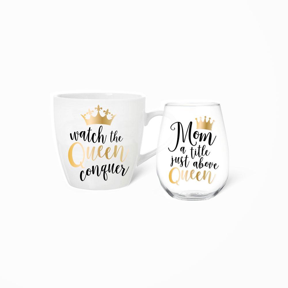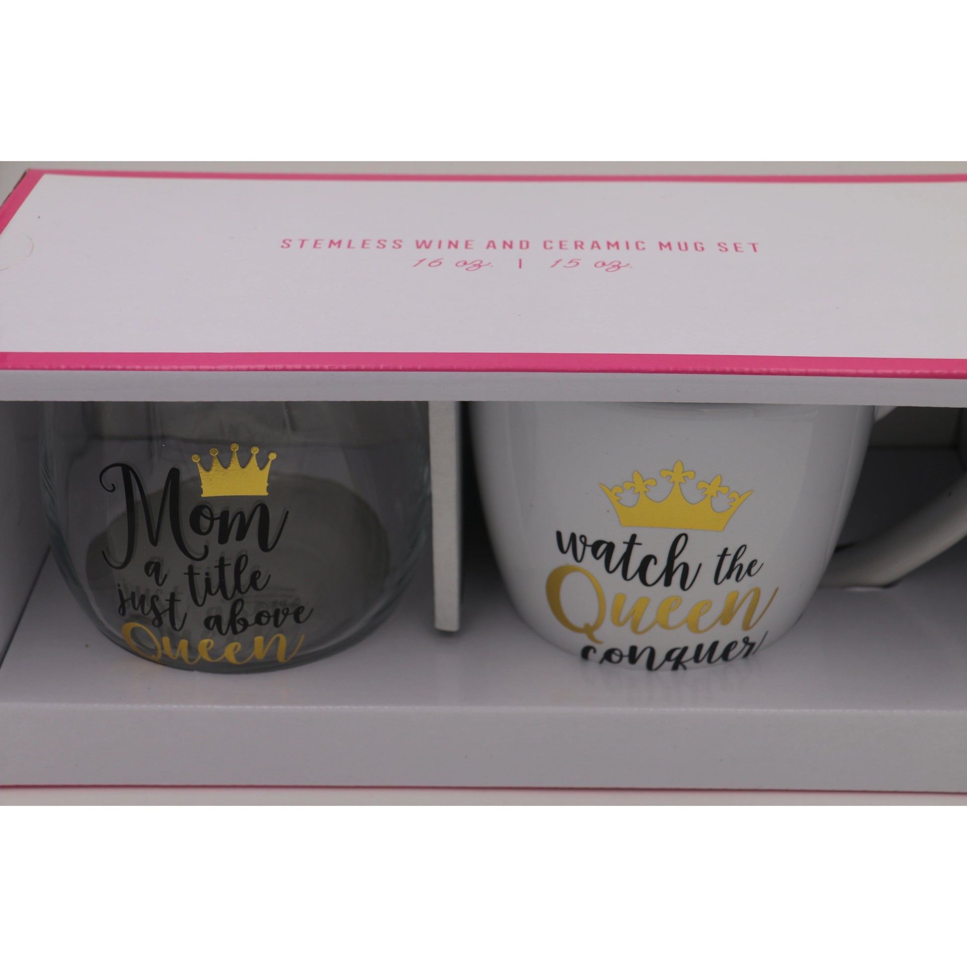 Comes with: 1 Mug, 1 Stemless Wine Glass