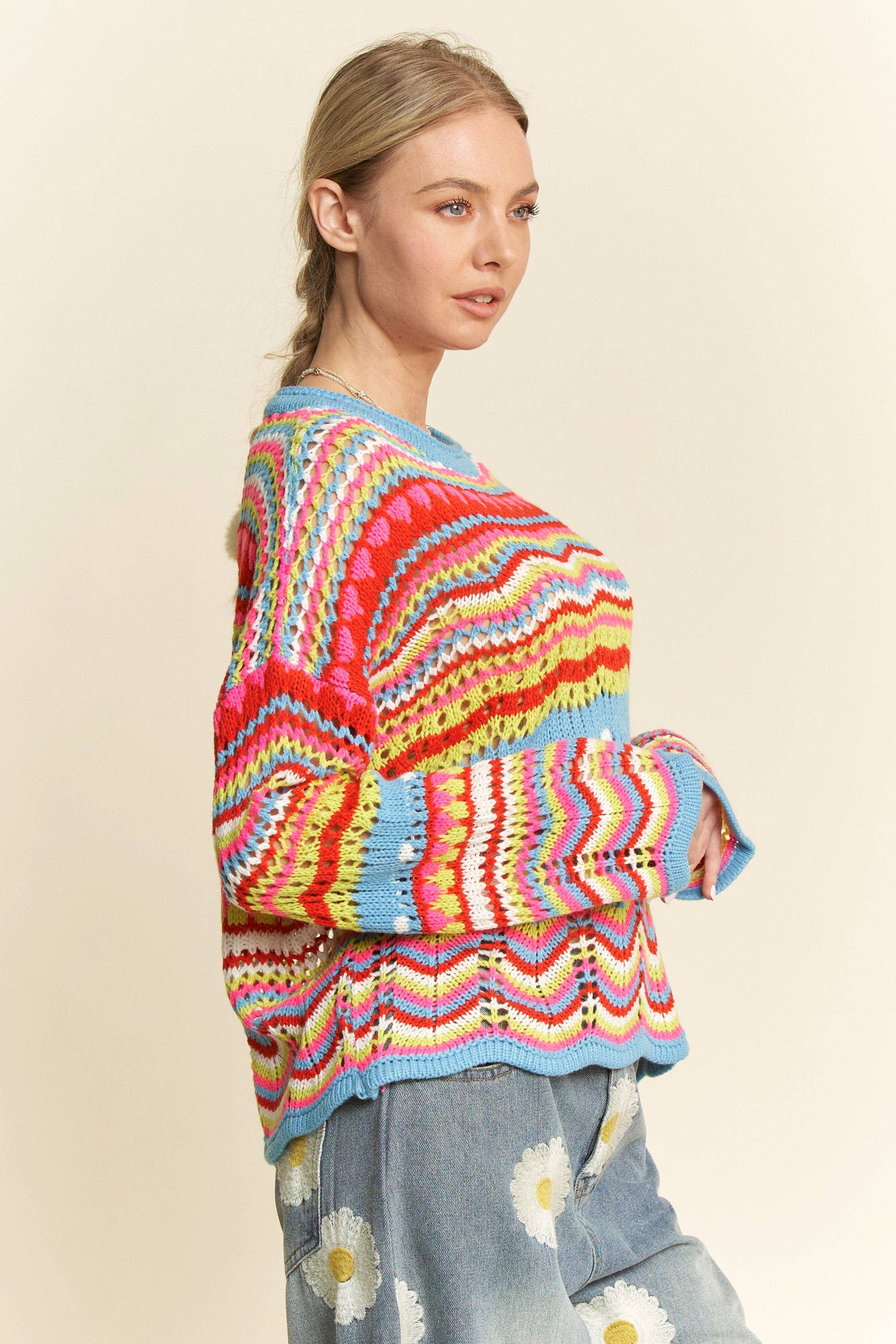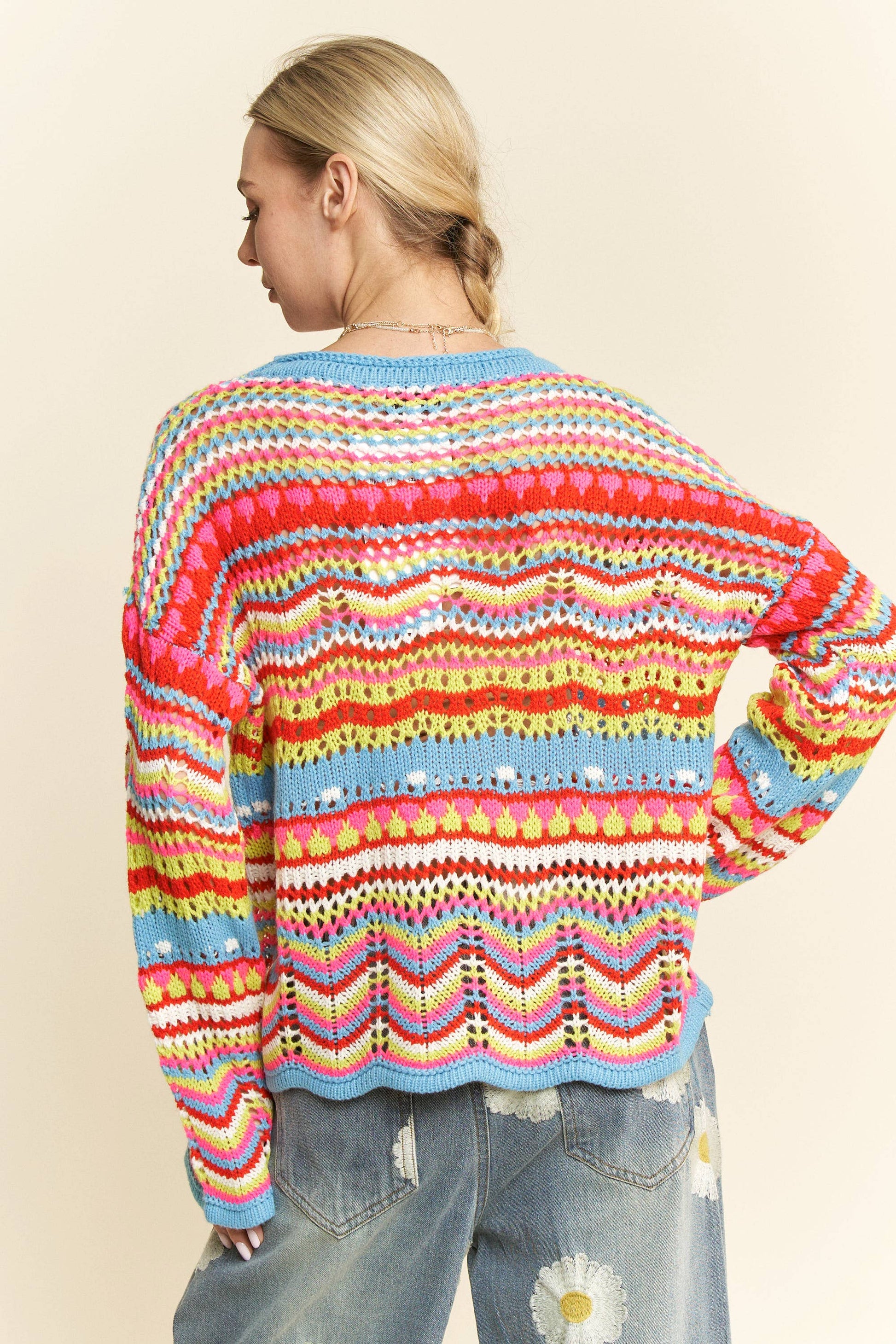 Proof that love doesn't have to be just pink and red. Meet your new electric obsession: a multi-textured masterpiece designed to stand out. This open-knit sweater features a "Technicolor" striped pattern in neon hues, blending cozy waffle stitches with airy, breathable textures. It’s the perfect "Galentine’s" statement piece—bright, bold, and incredibly soft. Layer it over a bralette or a slip dress for a look that’s pure 2026 energy.