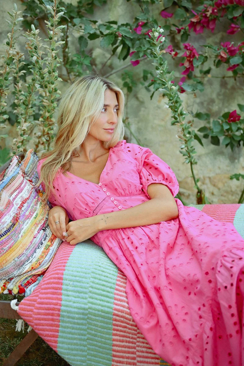 This long dress features intricate openwork embroidery and a flattering V neckline. The 3/4 volume sleeves add a touch of elegance, while the button details on the bust allow for a customizable fit. The slightly flared skirt ends in a large ruffle, making this dress a must-have for any special occasion.