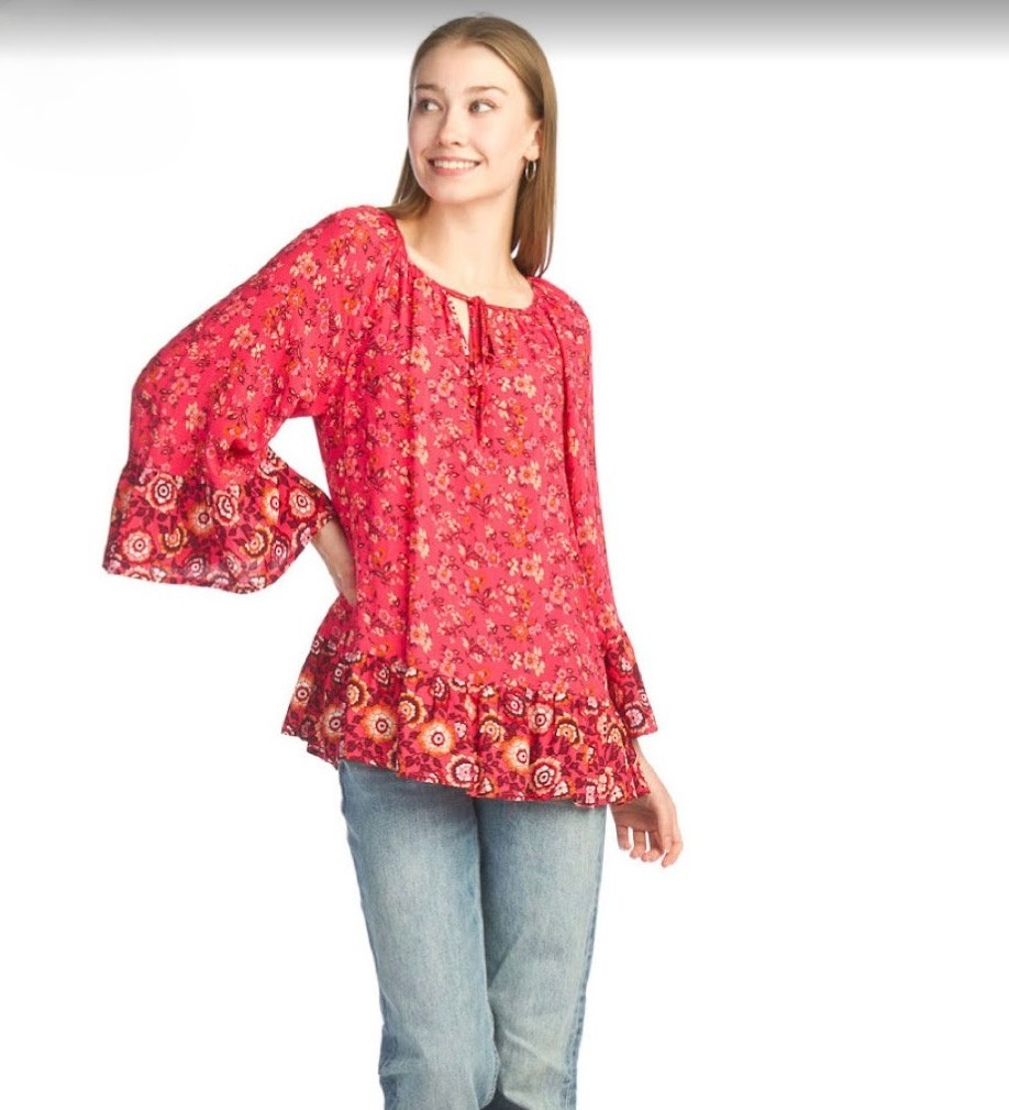 This red floral blouse features elegant bell sleeves that add a touch of sophistication to your look. Crafted with a vibrant floral pattern, it brings a fresh and feminine vibe to any outfit. Perfect for both casual and dressy occasions, this blouse combines comfort with style effortlessly.