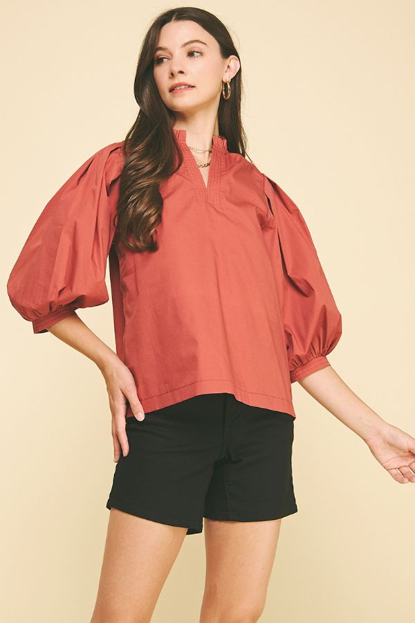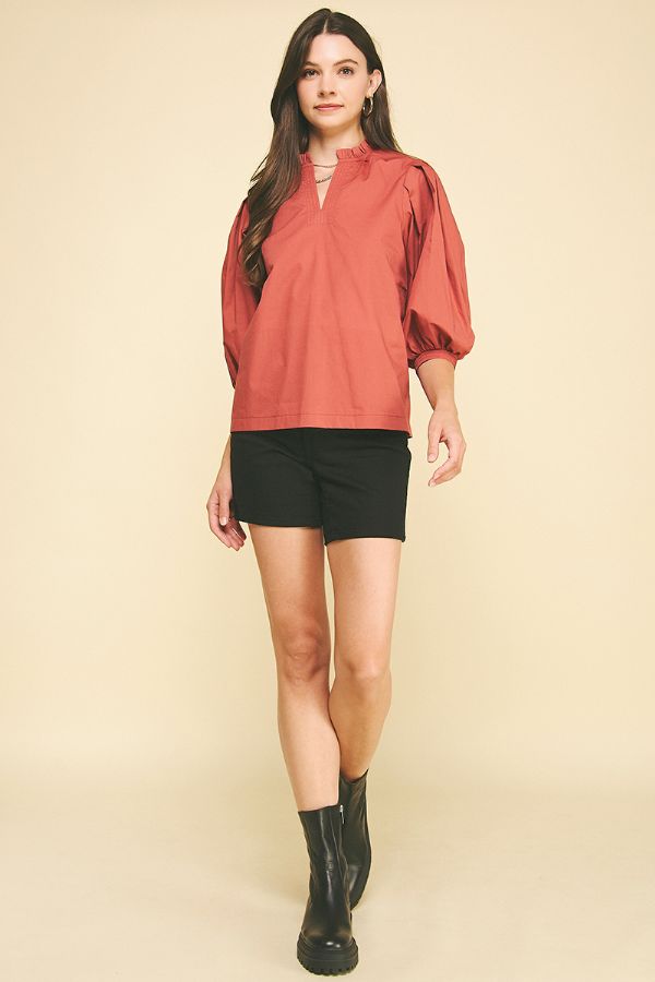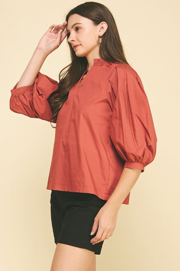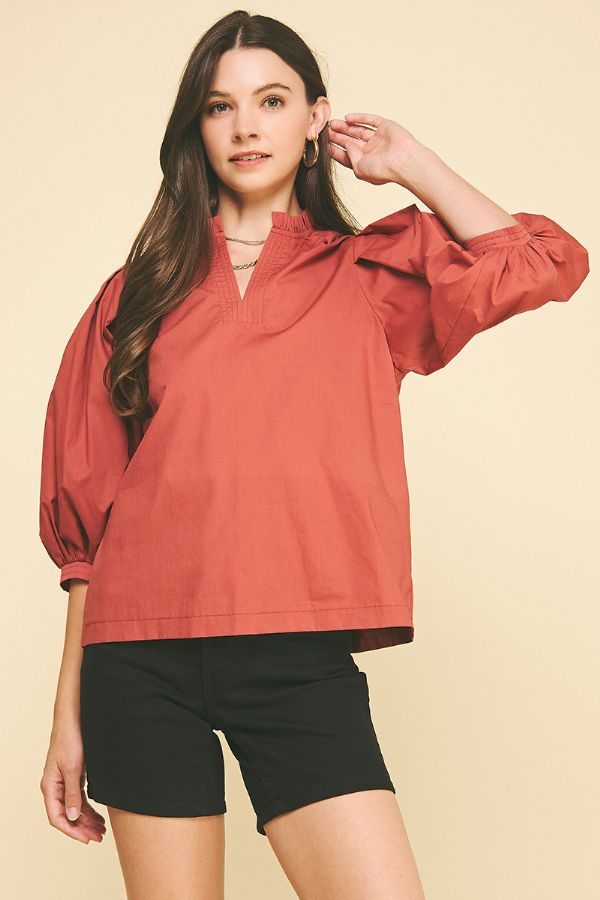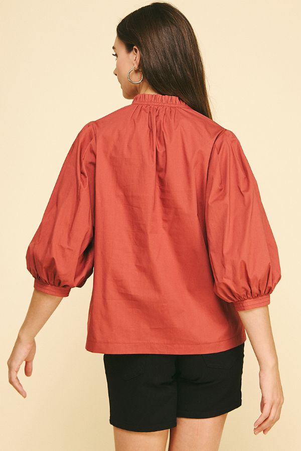 Elevate your everyday with this feminine poplin blouse, featuring a flattering V-neckline framed by a ruffled mock neck. The 3/4 sleeves add just the right touch of sophistication, making it perfect for workdays, dinners, or dressing up your favorite denim. Breezy, chic, and timeless—you’ll love reaching for this top again and again.