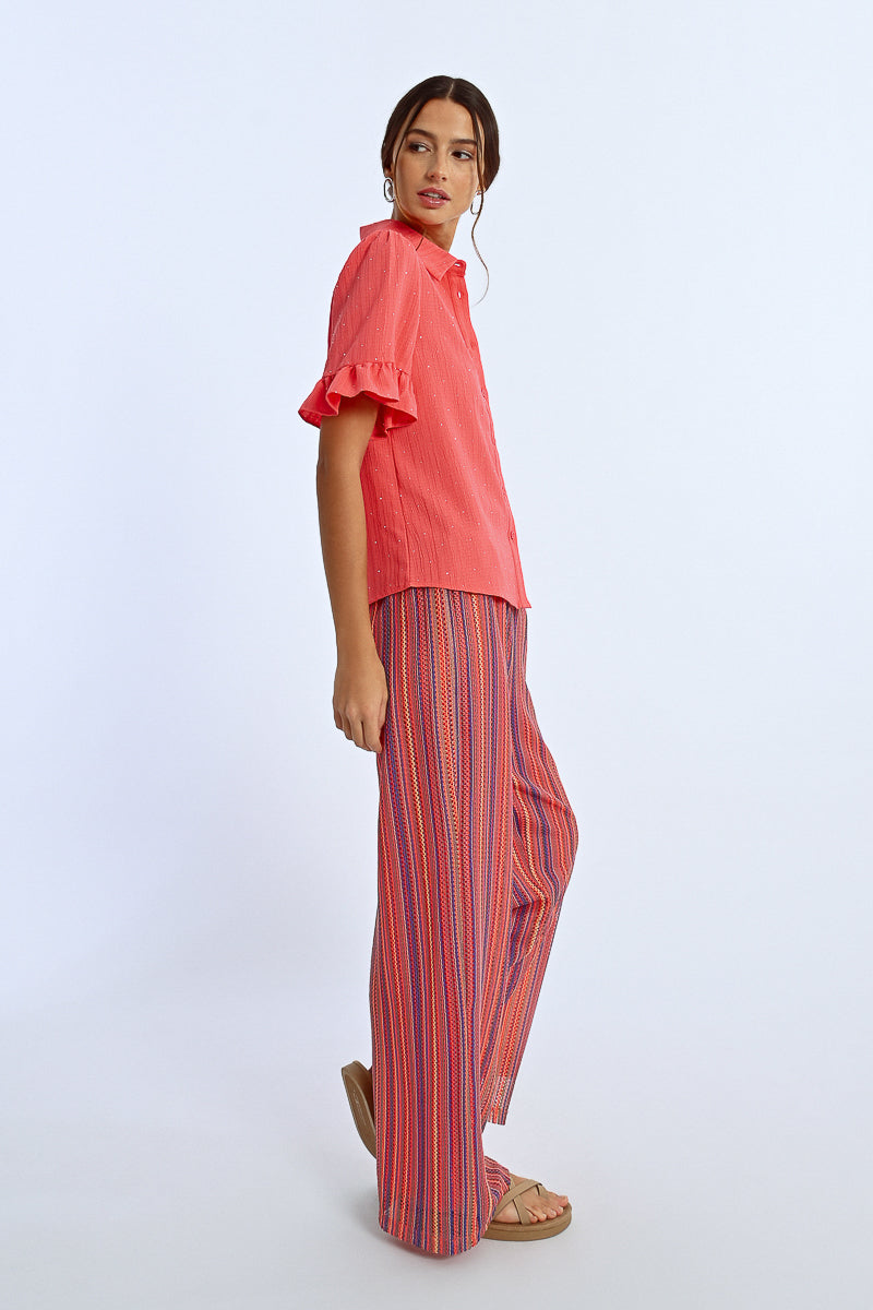 Elevate your wardrobe with our chic Ruffle Sleeve Button Up Blouse. The elegant ruffles add a touch of femininity, while the button-up design offers effortless sophistication. Perfect for any occasion, this blouse is a must-have staple that will elevate your style and bring versatility to your closet.