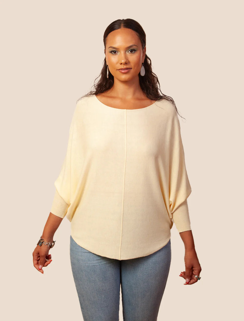 Our bestselling Ryu top is as soft as it is practical. While wearing the brand-new cashmere version, you will feel like you are wearing a piece of heaven. The added touch of the center seam and bat wing sleeve give this top a bit of extra dimension.