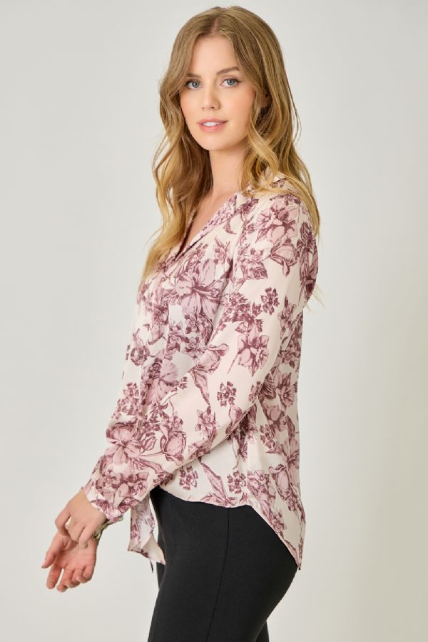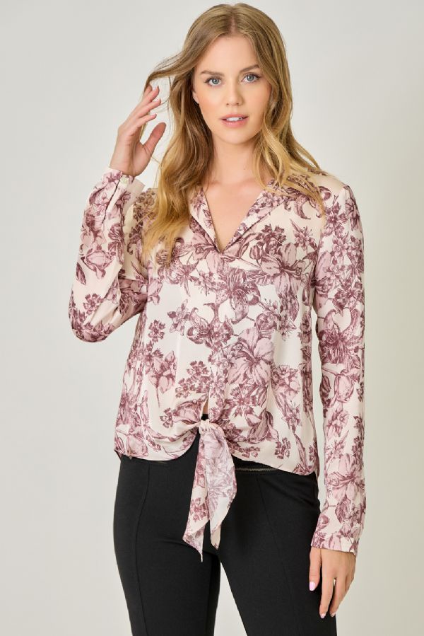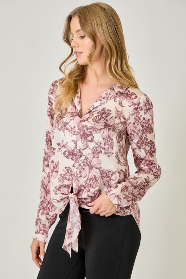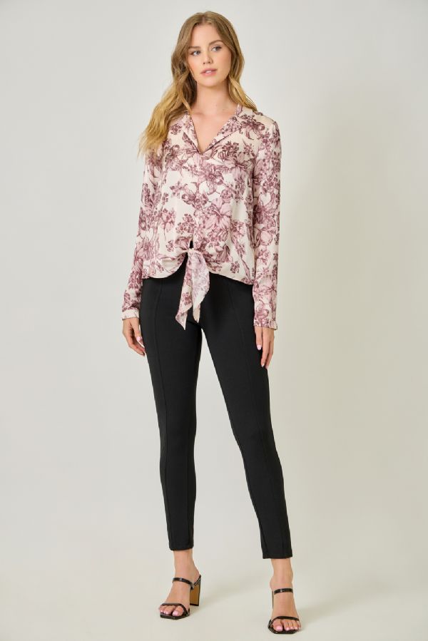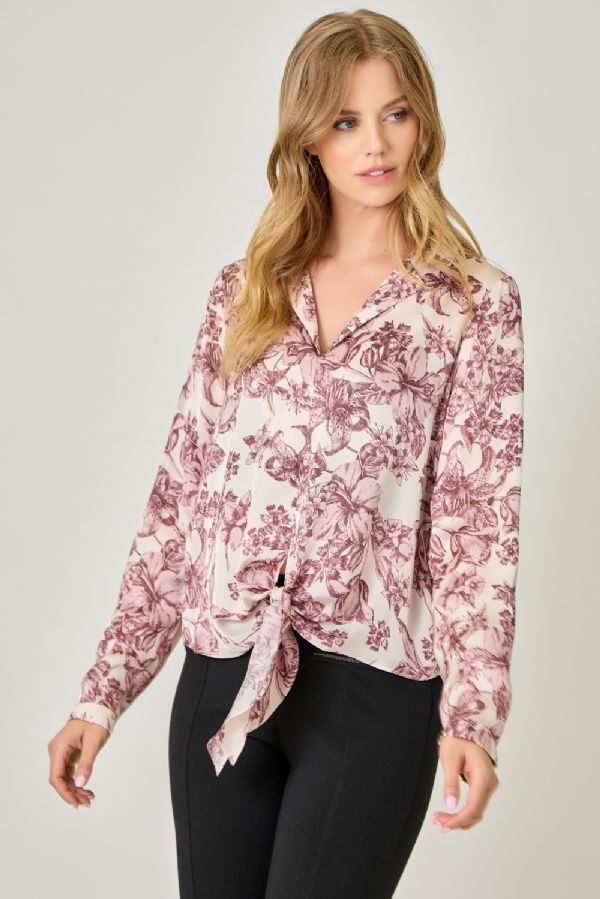 Effortlessly polished with a hint of play, this satin blouse is a true wardrobe gem. Featuring a collared V-neckline, tie-front detail, and long sleeves, it drapes beautifully in a loose, easy fit. The hi-lo hem adds just the right amount of flow, making it perfect for pairing with sleek trousers, denim, or a skirt. From office hours to after-hours, this blouse shines wherever you take it.