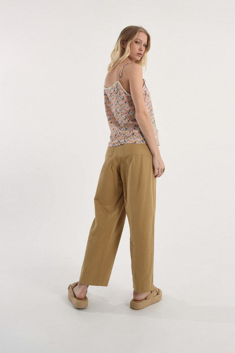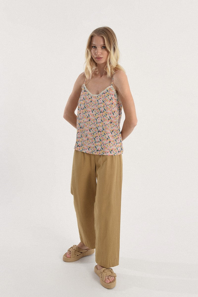 Scalloped lace trim on v-neck camisole, allover floral print.