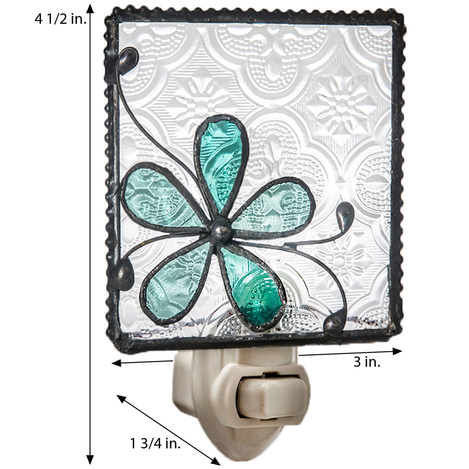 Add color and light to your bathroom, bedroom, or kitchen with this flower night light. Or, use as an accent light in dark corners or hallways and enjoy the soft colors and subtle light. Turquoise blue flower petals overlay a clear glass with an embossed vintage texture. Wire detailing and a beaded trim complete the vintage look. A great gift for a special someone or, add to your own home decor today!