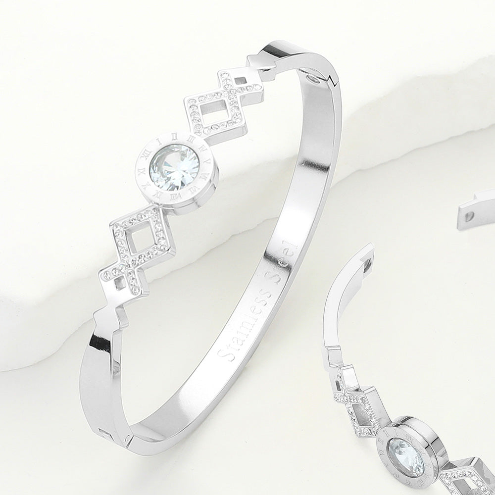Stainless Steel Round Stone Roman Numeral Engraved Pointed Hinged Bangle Bracelet
