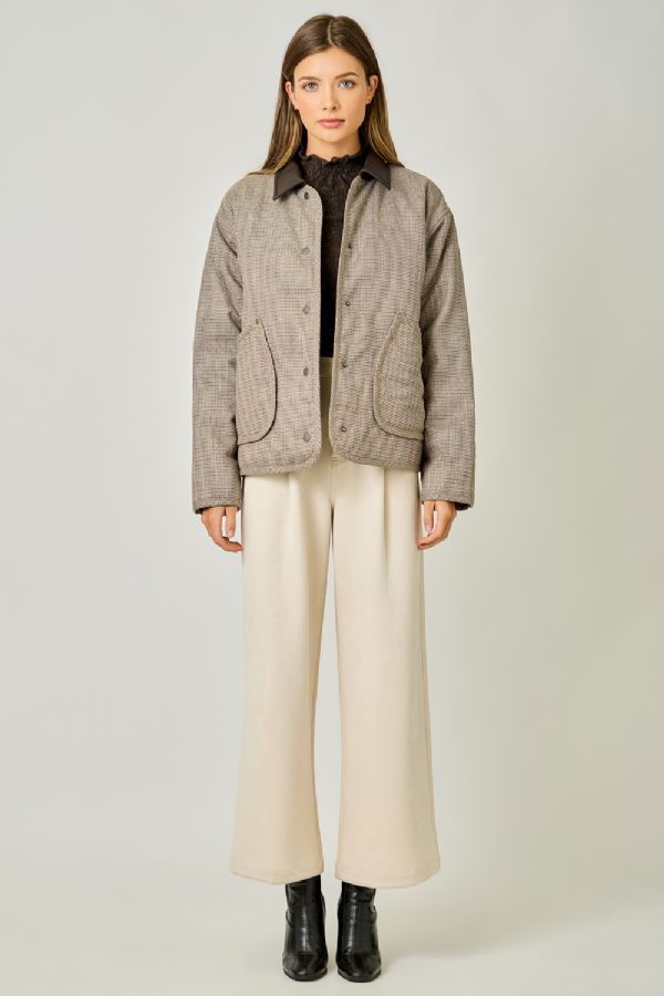 Shine bright while staying cozy in this chic puff jacket with just the right amount of sparkle. Designed with a sleek faux leather collar, snap button front, and roomy bottom pockets, it’s as functional as it is fabulous. The mocha/brown version glimmers with gold and silver lurex lines, while the grey/toffee brings a pop of gold and blue. Mini gemstones sprinkled throughout add the perfect twinkle, making this jacket your new go-to for everyday glam. 🌟