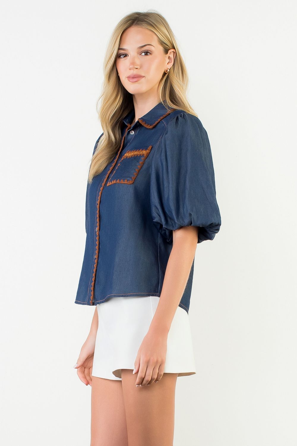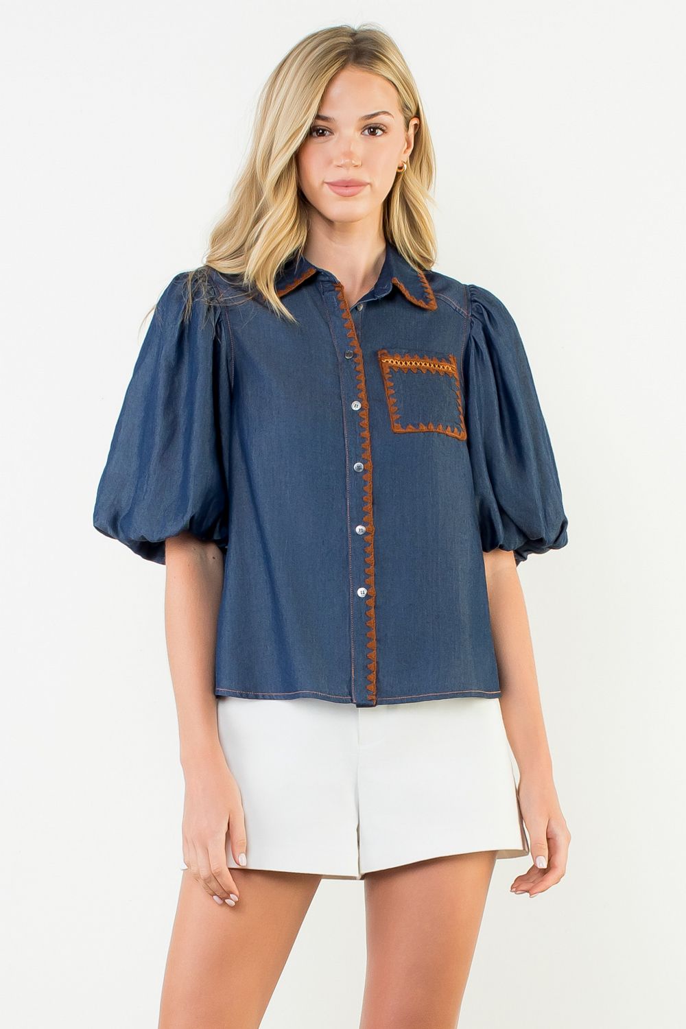 Your classic denim shirt just got a glow-up! This puff sleeve button-up brings a touch of feminine flair to rugged denim, while the piped stitch accents add just the right amount of detail. Pair it with white jeans for a fresh look, or go full denim-on-denim for an effortlessly cool vibe.