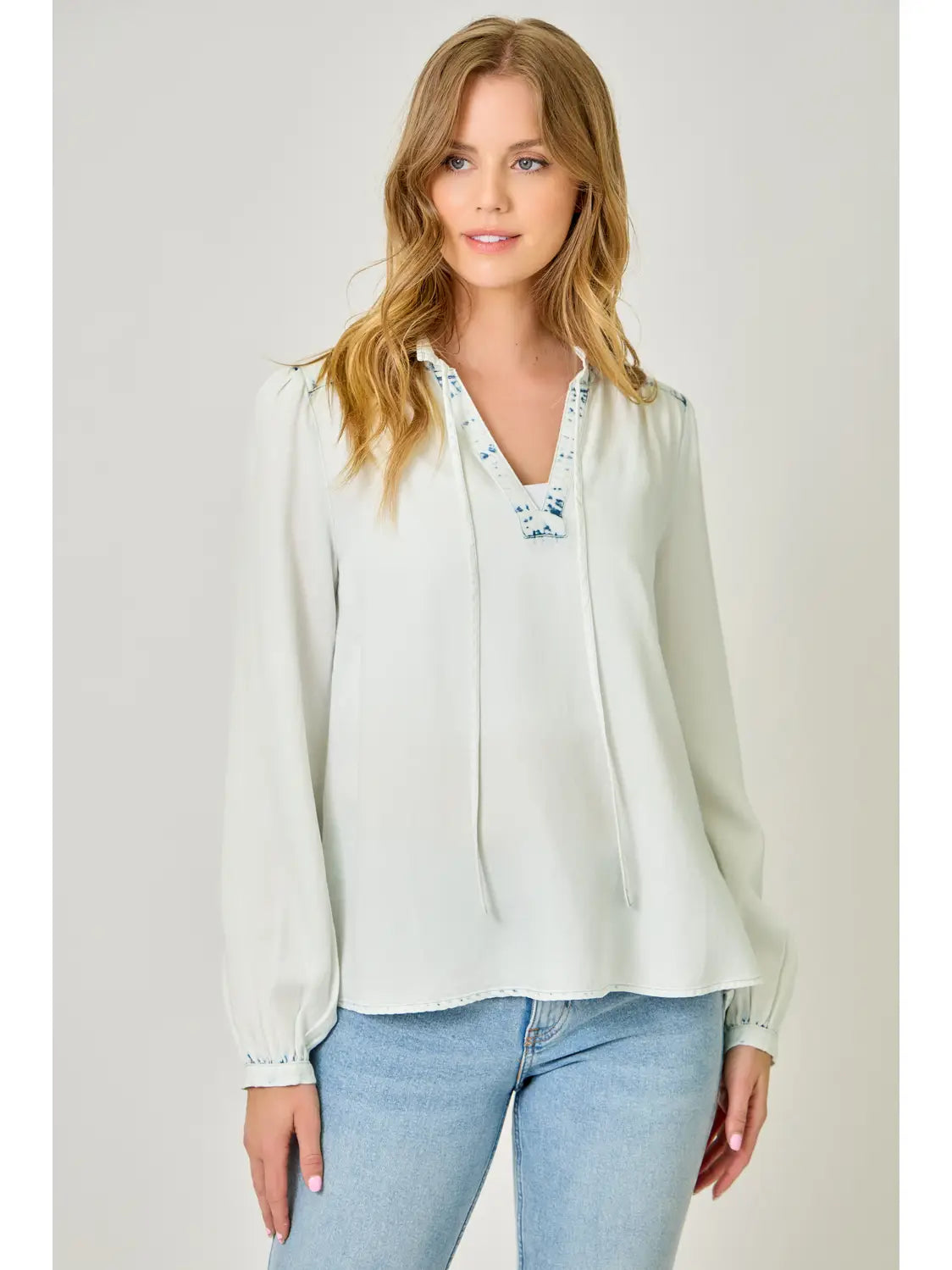 Effortless elegance meets everyday wear in this Tencel blouse. Designed with a flattering V-neckline and a delicate tie detail, it’s finished with a ruffled collar for just the right touch of femininity. Long bubble sleeves add movement and charm, while the loose fit keeps it comfortable and easy to style. Perfect for pairing with your favorite denim or dressing up for a polished look.