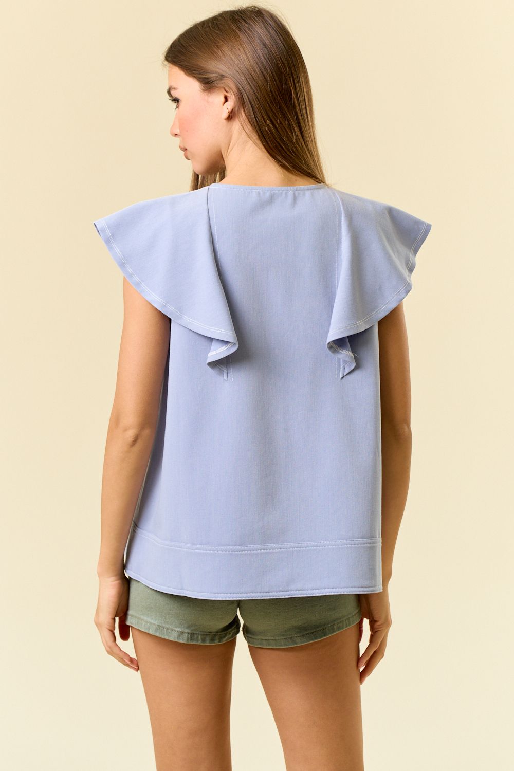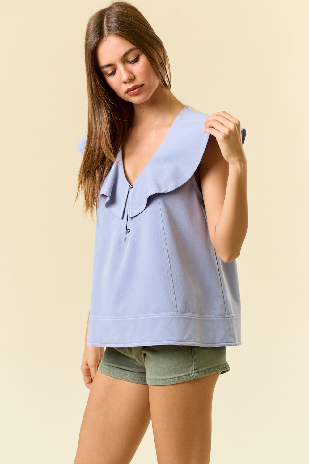 This Twill Ruffle-Neck Swing Blouse combines comfort and style with its relaxed, flowy fit and dramatic ruffle neckline that extends over the shoulders for a striking look. Crafted from a soft cotton-rayon blend, it features contrast stitching that accentuates its structure and adds modern detail. The front button-down closure with decorative buttons enhances the neckline and allows you to customize your look with ease. Perfect for effortless elegance and all-day comfort.