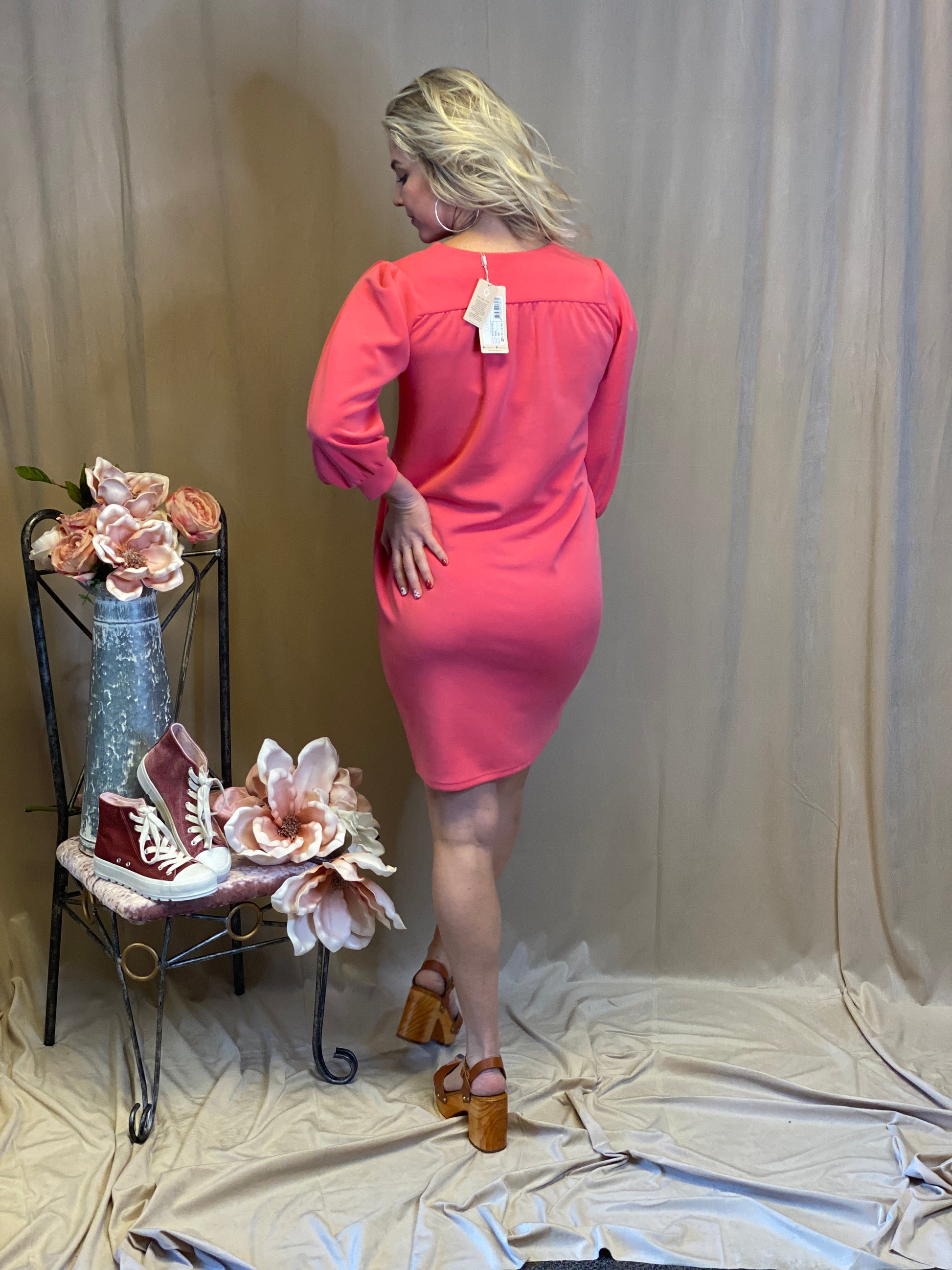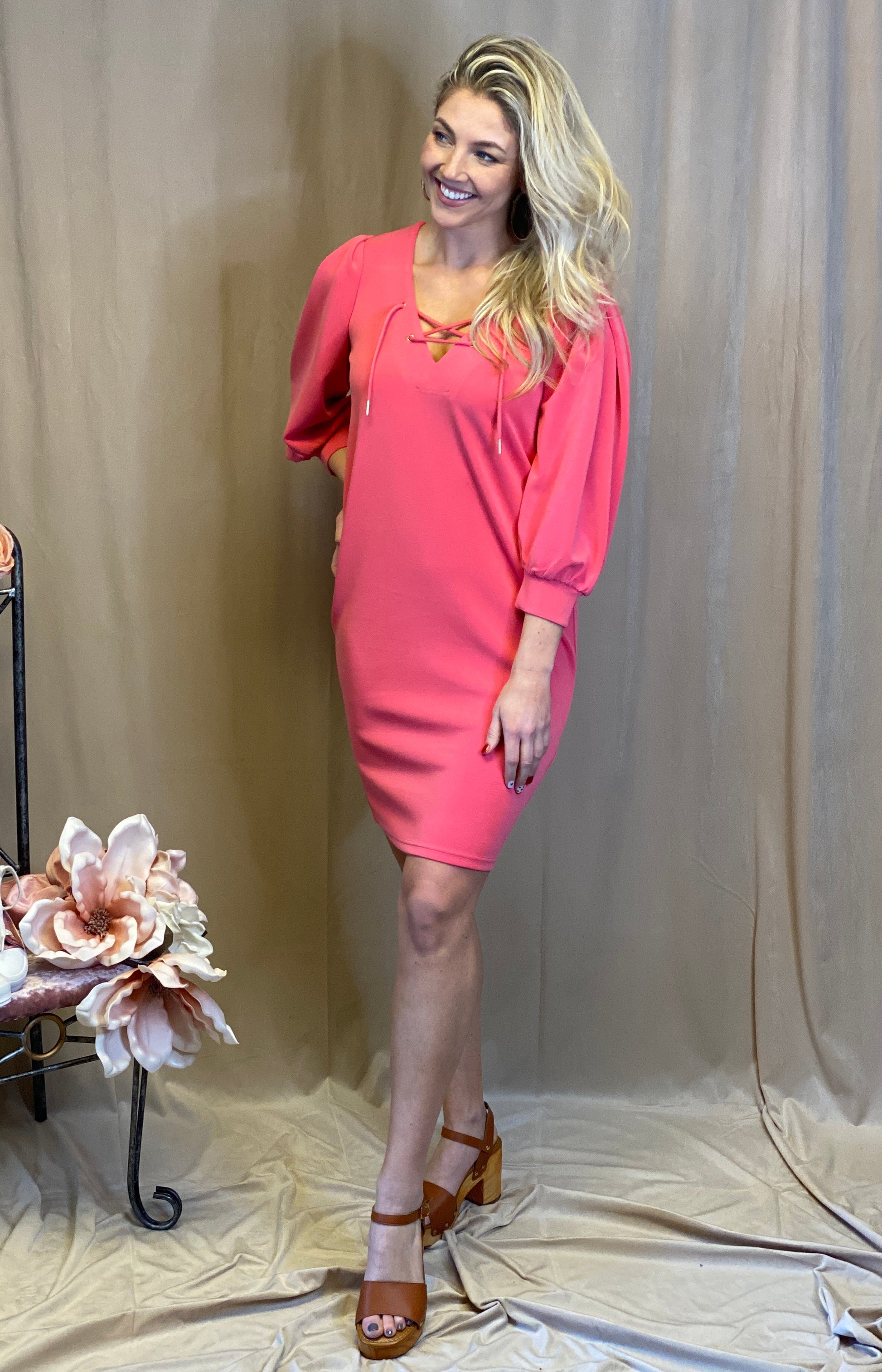 We're loving the on-trend bishop sleeves and laced up v-neck on this pretty mini dress. Cute, comfortable, and feminine is how you'll feel everytime you wear it!