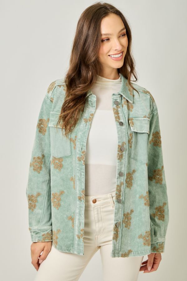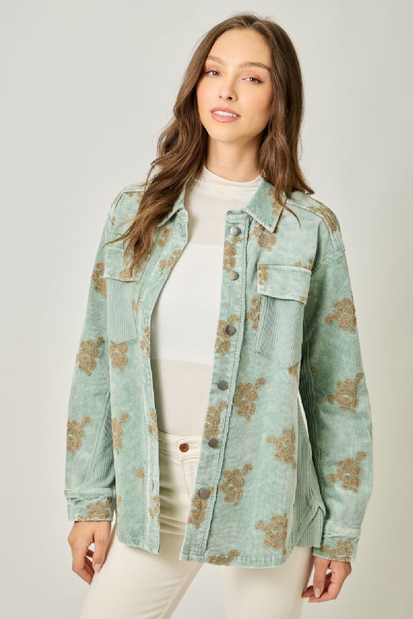 This isn’t your average corduroy jacket—it’s a little rustic, a little romantic, and totally wearable. The washed finish gives it that perfectly lived-in look, while delicate embroidery adds a touch of charm. Featuring a button-down front, chest pockets, and a flattering hi-lo hem, it’s finished with cozy thermal side panels (and pockets!) for extra comfort. The perfect layering piece for when you want casual with a hint of whimsy.